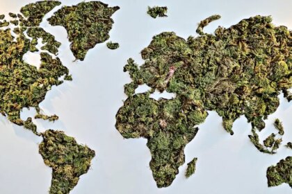 Um mapa do mundo coberto por musgo verde (foto) e uma estufa…