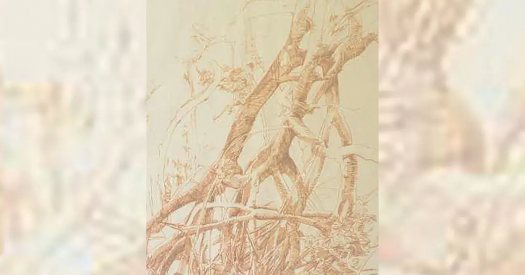 A partir de resquícios de natureza-morta, o artista elaborou a técnica que chamou de “flor de madeira”, com pedaços de troncos em decomposição e coloração vegetal.