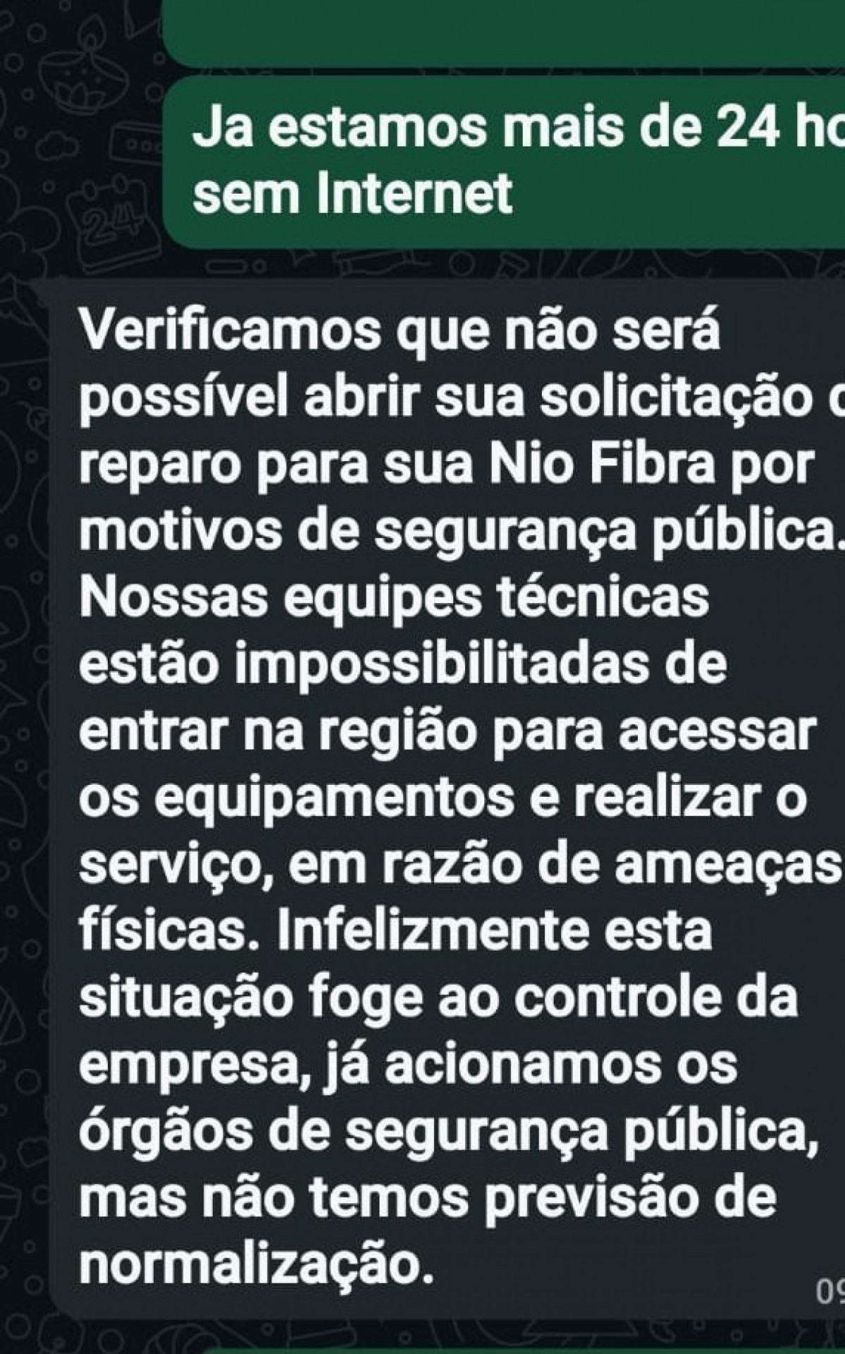 Na mensagem, a empresa cita a insegurança no local: “Verificamos que não será possível abrir sua solicitação de reparo para sua Nio Fibra por motivos de segurança pública. Nossas equipes técnicas estão impossibilitadas de entrar na região para acessar os equipamentos e realizar o serviço, em razão de ameaças físicas. Infelizmente esta situação foge ao controle da empresa, já acionamos os órgãos de segurança pública, mas não temos previsão de normalização”, disse.