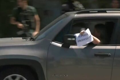 com medo de ser baleada, mulher passa em meio à operação da polícia com cartaz avisando profissão