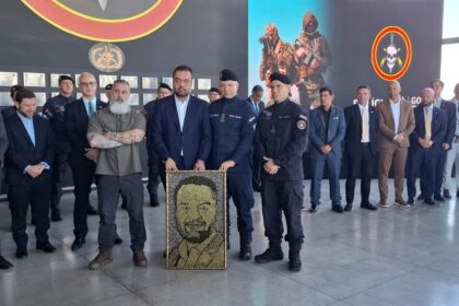 Cláudio Castro ganha retrato feito com cápsulas de bala em evento na sede do Bope