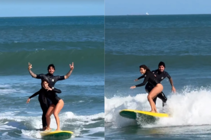 Apaixonado! Gabriel Medina ensina a nova namorada a surfar
