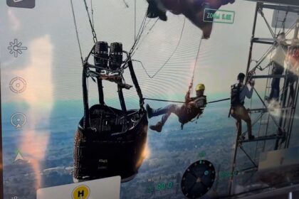 Dupla é resgatada após balão ficar preso em torre com antena de celular