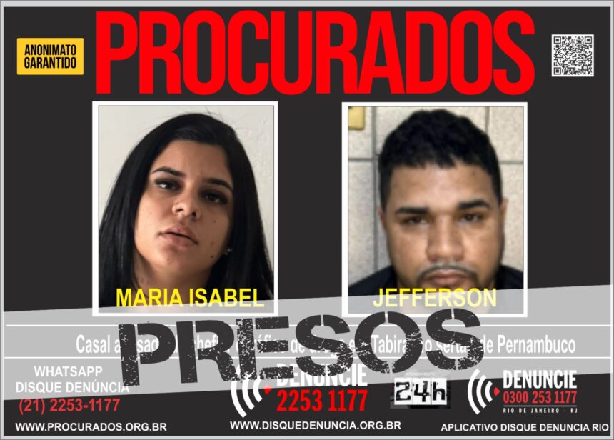 Após trabalho de análise de dados, policiais militares da Subsecretaria de Inteligência da Polícia Militar do Rio (SSI/SEPM), em ação conjunta com policiais do 22º BPM (Maré), após informações que foram repassadas pela Central Disque Denúncia (2253-1177), prenderam, na manhã desta segunda-feira (15), na Rua Ouricuri, em Ramos, Zona Norte do Rio, os foragidos da justiça, Jefferson Amancio de Lima, de 32 anos e Maria Isabel da Costa Oliveira, de 24. Eles seriam as principais lideranças do tráfico de drogas, em boa parte do município de Tabira, localizado no sertão do Pajeú, em Pernambuco/PE.