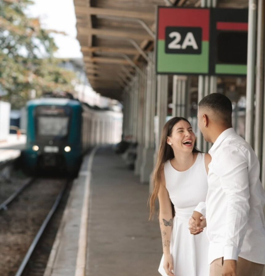 Foi justamente essa simplicidade que inspirou o casal quando decidiram se casar no último mês. Trabalhando como influenciadores digitais, eles queriam que a notícia do casamento fosse o anúncio — e encontraram nos trens da SuperVia o cenário perfeito. A escolha se completou com outros cenários do Rio que marcaram o namoro: os vagões do ramal Santa Cruz, a placa da Central do Brasil, as ruas do centro histórico, o CCBB, o Theatro Municipal, o Palácio Tiradentes e o Largo da Candelária.