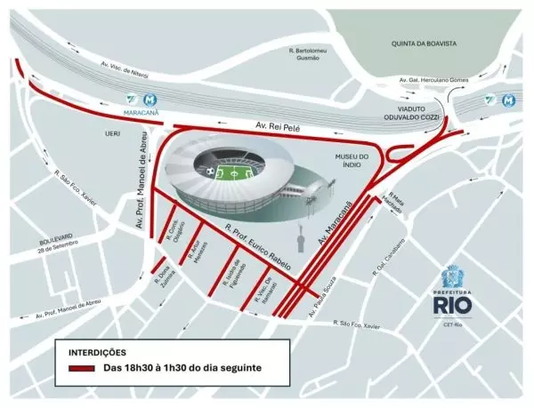 A CET-Rio realiza, nesta quinta-feira (26), uma operação de trânsito para o jogo entre Flamengo e Lanús — da Argentina —, às 21h30, no Maracanã, pela Recopa Sul-Americana. As interdições na região começam a partir das 18h30 e vão até 1h30 de sexta-feira (27).