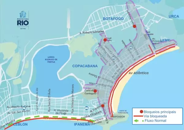 • 7h: interdição total da Avenida Atlântica, em toda a sua extensão até o Leme, em todas as pistas, além das avenidas Delfim Moreira e Vieira Souto.