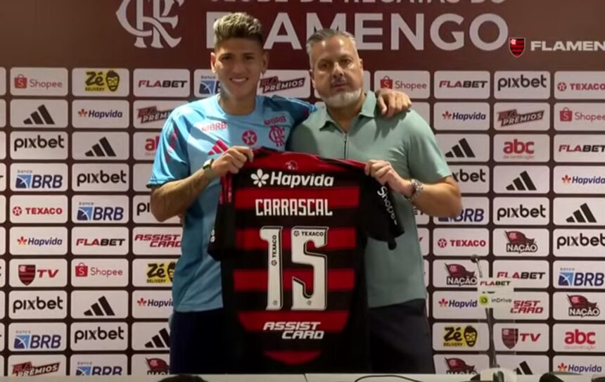 Jorge Carrascal chega com um rótulo pesado de se carregar: o de substituto de Arrascaeta. O colombiano é a aposta do clube num armador de jogadas que possa revezar com o uruguaio, dono da posição desde 2019, mas que dá sinais de estar sobrecarregado fisicamente. Apresentado nesta segunda com a camisa 15, o novo reforço buscou logo descartar qualquer competição com o titular.