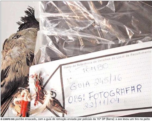 A vítima? De combinação com o laudo, “uma ave do gênero columba (pombo), sem nome e nem proprietário. Tamanho: 34 centímetros; cor: cinza, preto e branco; sinais particulares: não os possui”.