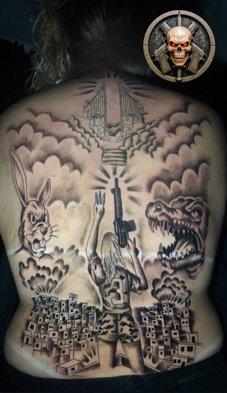 A tatuagem nas costas reforçava essa posição: a imagem mostrava uma mulher armada, fazendo o número três em referência ao TCP, além de um coelho, em homenagem a William Yvens da Silva, o Coelhão, e um jacaré, que representava Wallace de Brito Trindade, o Lacoste, ambos chefes do TCP, e alvos da operação policial desta terça-feira.