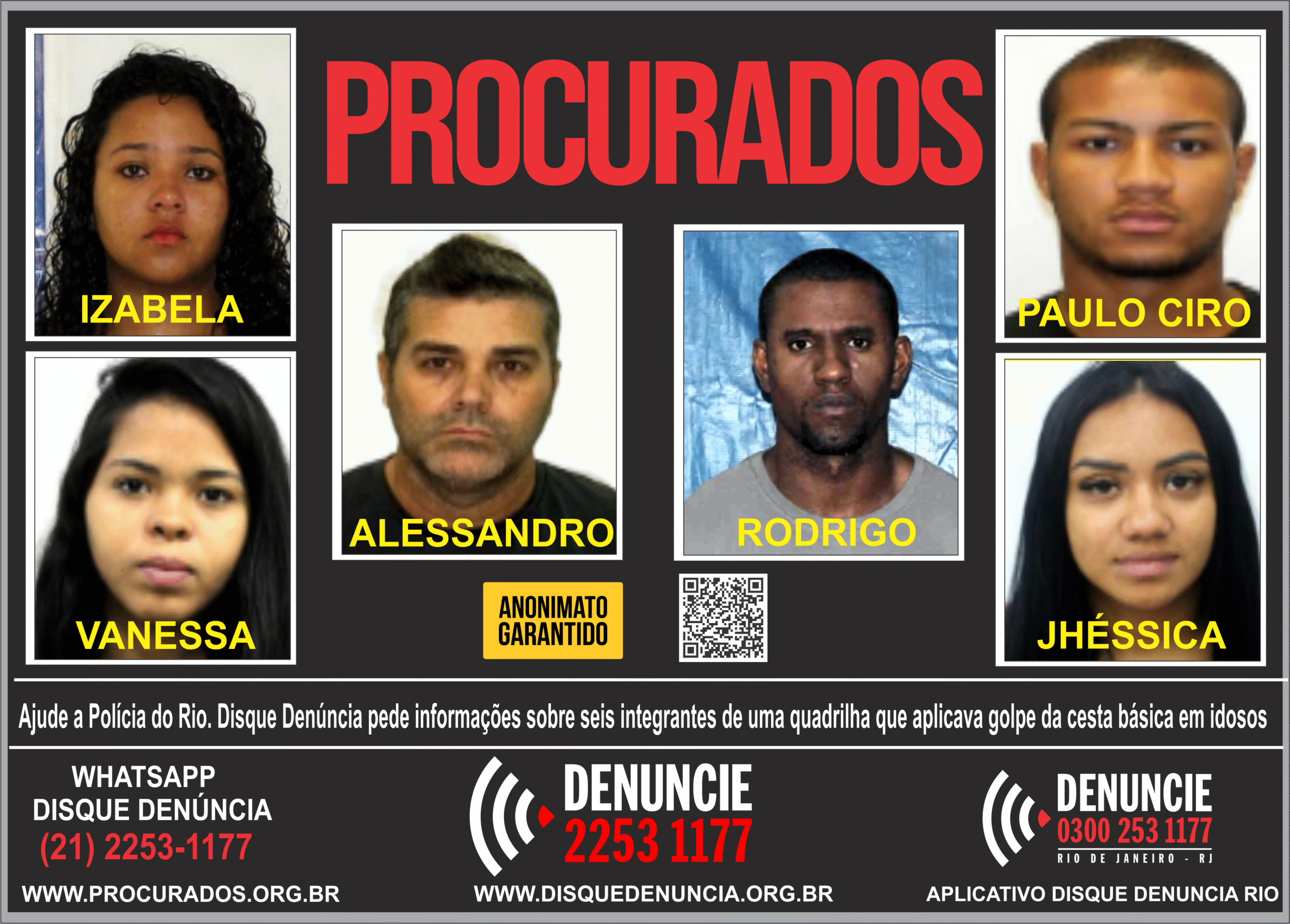 O Disque Denúncia (2253-1177) divulgou, nesta terça-feira (12), um cartaz para auxiliar nas investigações da 118ª DP (Araruama), na Região dos Lagos do Rio de Janeiro, a fim de obter informações que levem à localização e prisão de: Izabela da Silva Gomes, de 30 anos; Vanessa Cristina Cunha Cordeiro, de 28; Alessandro Ribeiro Maia, de 47; Rodrigo Ribeiro dos Anjos, de 39; Paulo Ciro Estevão Mendonça, de 26 e Jhéssica Sthefany Andrade da Silva, de 27. Eles são acusados pela polícia de fazer parte de uma quadrilha que aplicava o golpe da “Cesta Básica”, em idosos, no município de Araruama situado no interior do estado do Rio de Janeiro.
