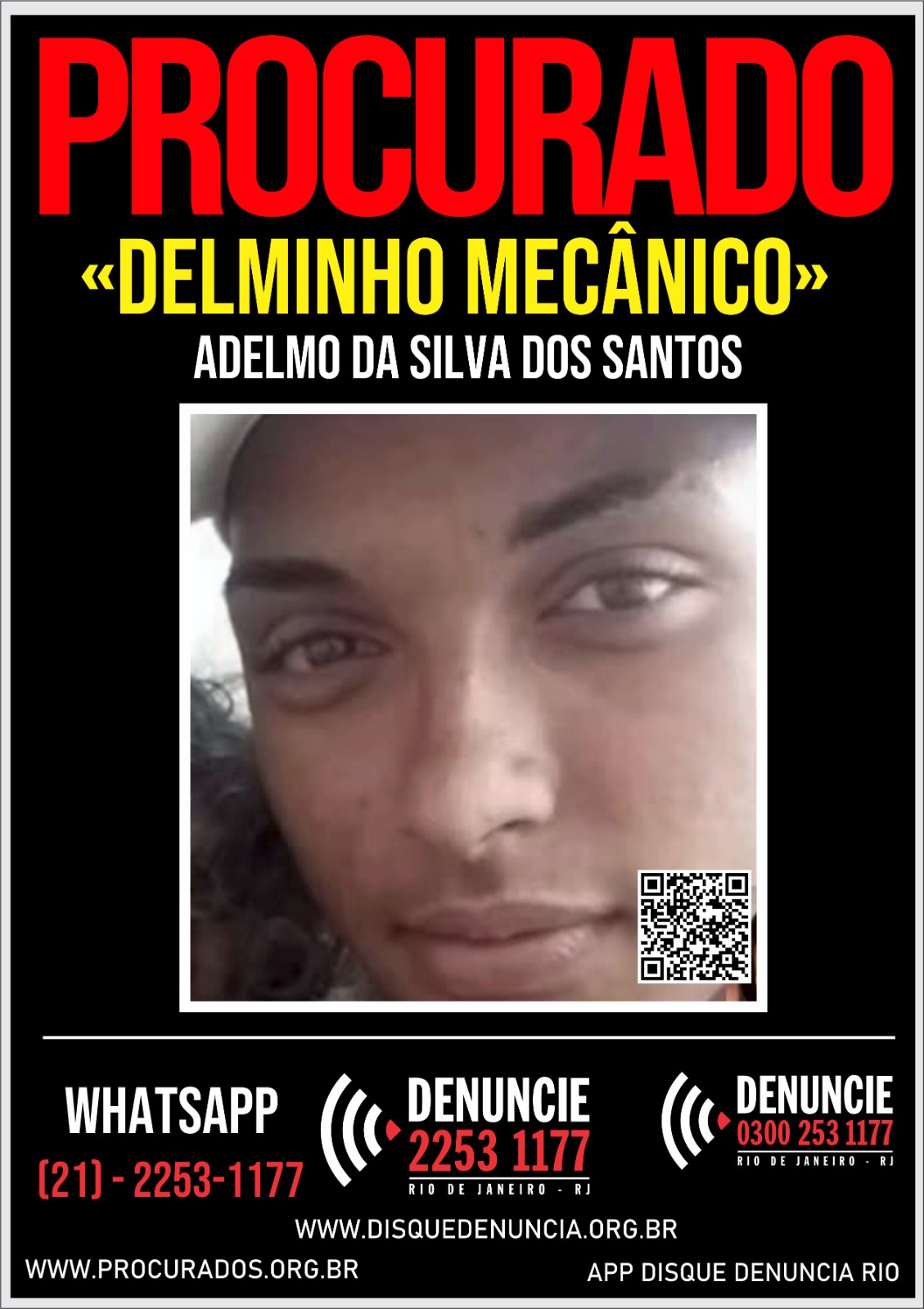 O Disque Denúncia (2253-1177) divulga, nesta terça-feira (18), um cartaz para auxiliar nas investigações da 119ª DP (Rio Bonito) em conjunto com a 70ª DP (Tanguá), a fim de obter informações que levem à localização e prisão de Adelmo da Silva dos Santos, vulgo “Delminho Mecânico”, de 20 anos, principal suspeito de um possível crime de duplo homicídio de um casal que se encontra desaparecido desde a manhã de domingo (16).