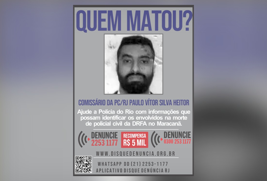 O Disque Denúncia (21 2253-1177) divulgou um cartaz pedindo pistas dos assassinos do policiais civil Paulo Vítor Silva Heitor. Ele foi morto durante uma tentativa de assalto ocorrida na madrugada deste domingo na Rua Visconde de Itamarati, no Maracanã, Zona Norte do Rio. PV, como era conhecido estava com a esposa, que foi atingida num dedo das mão esquerda.