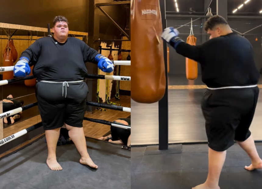 Recentemente, o influenciador, de 20 anos, fez uma montagem com um antes e um depois e contou que perdeu 115 quilos com exercícios físicos e novos hábitos alimentares. Ele está pensando atualmente 230kg.