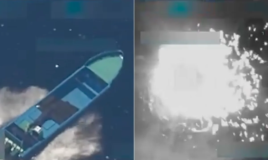 A mensagem de Hegseth é acompanhada por um vídeo colorido mostrando um barco em alta velocidade em alto mar até ser completamente destruído.