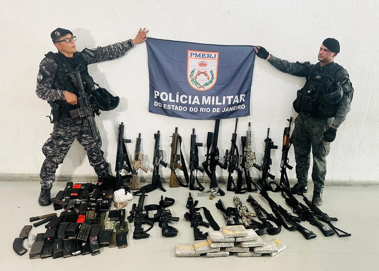 Na casa, um homem foi encontrado morto e 25 suspeitos foram detidos, dois deles adolescentes. Mais da metade não era do Rio: 11 eram naturais da Bahia, quatro do Pará, um do Maranhão e um de Pernambuco. A busca no imóvel resultou na apreensão de um revólver e 19 fuzis — entre eles, o armamento desviado da PM, produzido pela Indústria de Material Bélico do Brasil (Imbel), estatal vinculada ao Exército, em Itajubá. A arma traz gravada numa parte em metal a inscrição “Estados Unidos do Brasil – 15 de Novembro de 1889”, o que indica tratar-se de um “patrimônio das forças de segurança pública”, segundo escreveu no laudo o perito responsável por analisar o fuzil.