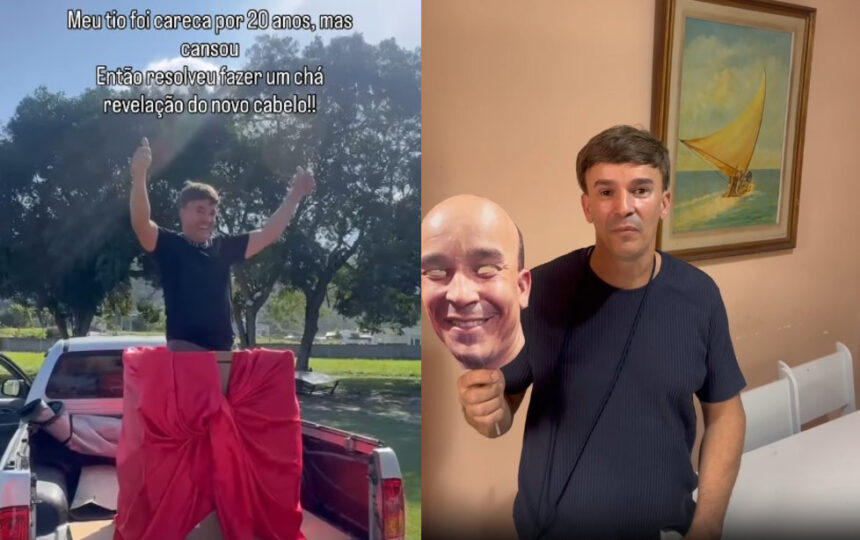 Um “chá revelação” inusitado organizado por uma família de São Gonçalo tem dado o que falar nas redes sociais. O comerciante Rodrigo Pereira, que nasceu em São Gonçalo e hoje mora em Maricá, reuniu seus familiares para revelar que deixou a careca para trás e colocou prótese capilar. O momento inusitado foi compartilhado nas redes sociais e o vídeo já ultrapassou um milhão de visualizações no Instagram.