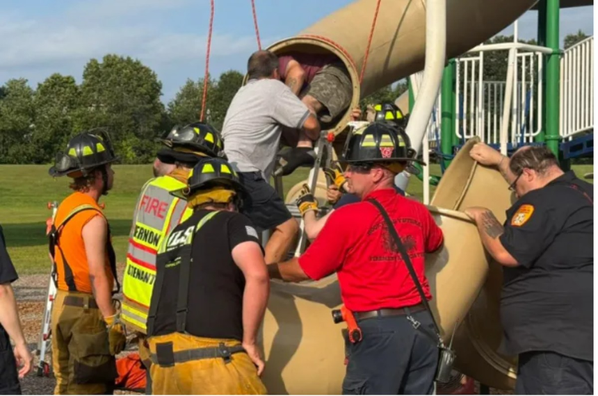 Uma foto de bombeiros trabalhando para resgatar um homem que ficou preso num escorregador