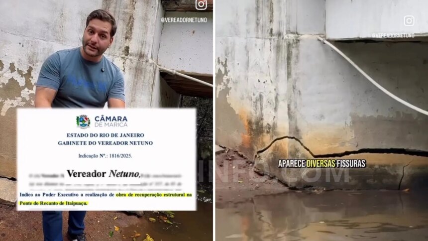 O vereador de Maricá, Ricardinho Netuno (PL), publicou nesta semana um vídeo em suas redes sociais denunciando a condição estrutural da principal ponte do bairro Recanto, em Itaipuaçu. A estrutura é o único acesso entre as duas margens do canal, ligando a área residencial à região da praia — ponto que recebe grande fluxo de moradores, turistas e comerciantes na alta temporada.