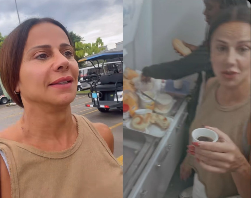 Depois, ela foi filmada pelo maquiador Maxwell Pinheiro tomando um café da manhã superreforçado com suco, bolo e pães. “Hoje não é o desfile, pode a rainha de bateria ter esse café da manhã?”, brincou o rapaz.