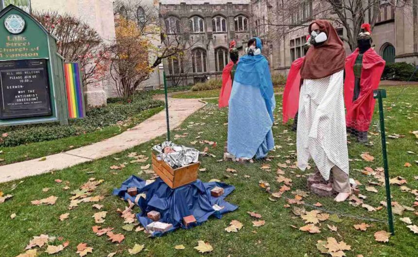 Uma igreja em Chicago colocou o recém-nascido Menino Jesus algemado e coberto com papel-alumínio, como nos centros de detenção migratória, e uma Virgem Maria usando máscara contra gás lacrimogêneo.