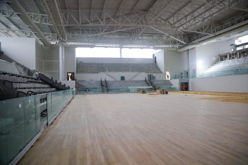 A cobertura do ginásio já foi concluída, marcando uma etapa importante do projeto. No interior do equipamento, as equipes trabalham no rebaixamento em gesso dos forros, serviços de pintura, colocação do piso interno e na instalação dos dutos de ar-condicionado, além de guarda-corpos, corrimãos e cadeiras das arquibancadas.