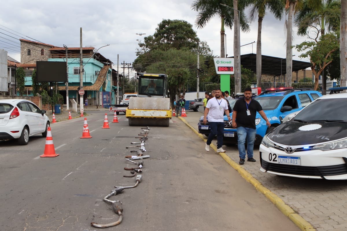 Na ação, cerca de 20 escapamentos adulterados de motocicletas, conhecidos como torbais, foram apreendidos e destruídos em espaço público. A medida teve autorização da Justiça de Italva com apoio do promotor de Justiça dr. Marcelo Alvarenga.