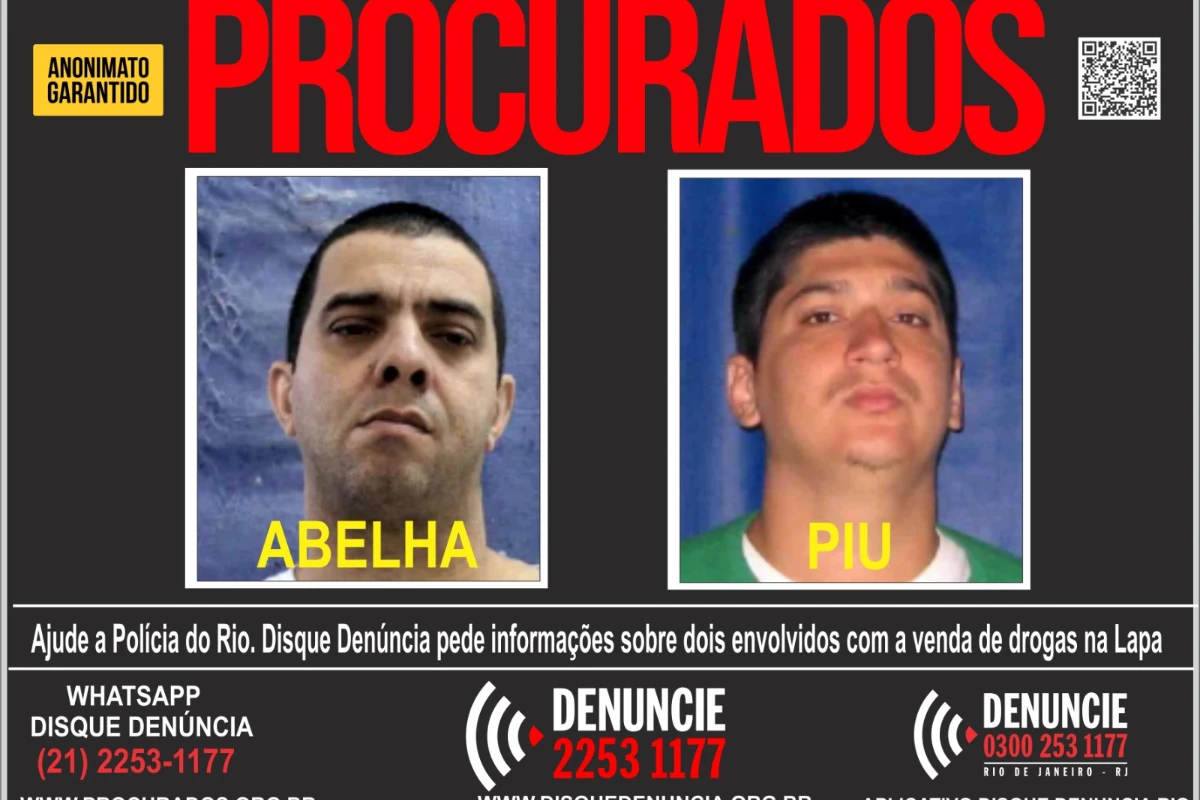 A Polícia Civil do Rio de Janeiro (PCERJ) procura os chefes do Comando Vermelho (CV) responsáveis pelo tráfico de drogas na região da Lapa, no Centro da capital fluminense. Os chefes da facção são identificados como Wilton Carlos Rabello Quintanilha, o “Abelha”, e Anderson Venâncio Nobre de Souza, o “Piu” ou “Português”.