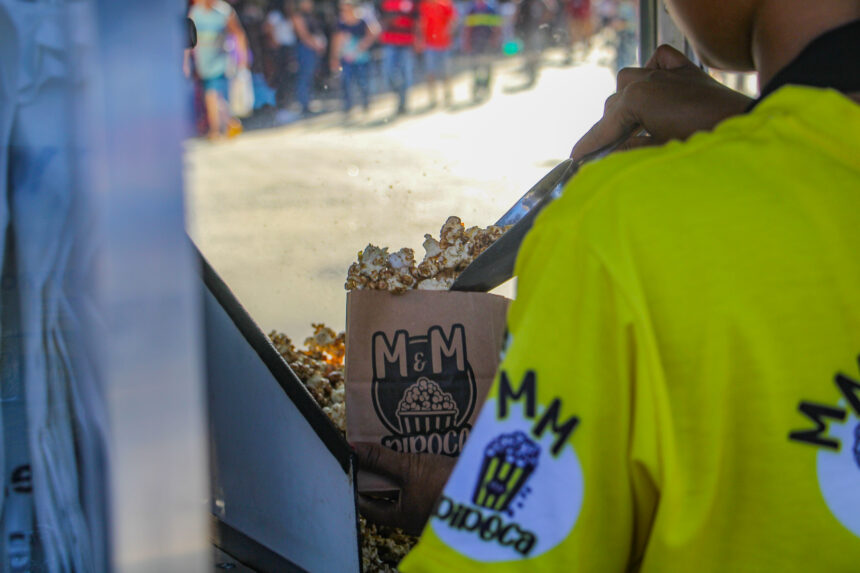“É fila o dia inteiro. Desde que a gente abre, ao meio-dia, já tem gente aqui. E o pessoal gosta bastante; no final de semana, que temos o camarão, as pessoas enfrentam filas de meia hora e depois vêm falar para a gente que valeu a pena esperar porque ‘a pipoca é boa demais’”, conta Mônica de Almeida, de 45 anos, que fundou a barraca com o sócio Allan Ismere, de 39 anos.