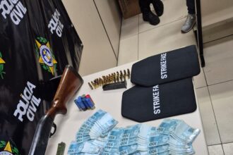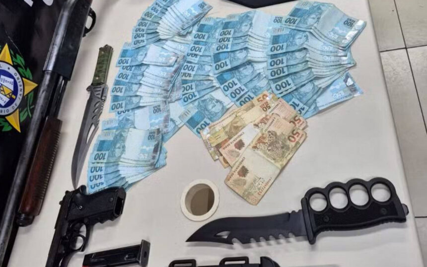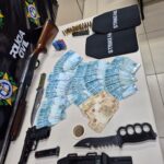 No local, as equipes apreenderam uma espingarda com farta munição, uma pistola municiada, duas televisões pertencentes à vítima, dois cadernos contendo anotações relacionadas à prática de agiotagem, além de equipamentos táticos, colete balístico, facas e até um tucano.