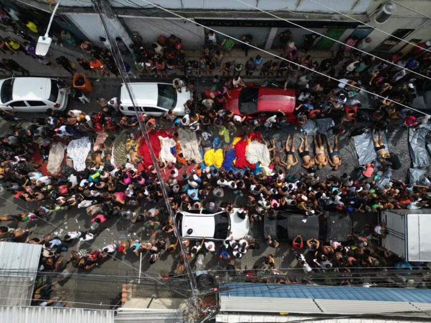 No dia seguinte à megaoperação, moradores levam corpos para praça do Complexo da Penha