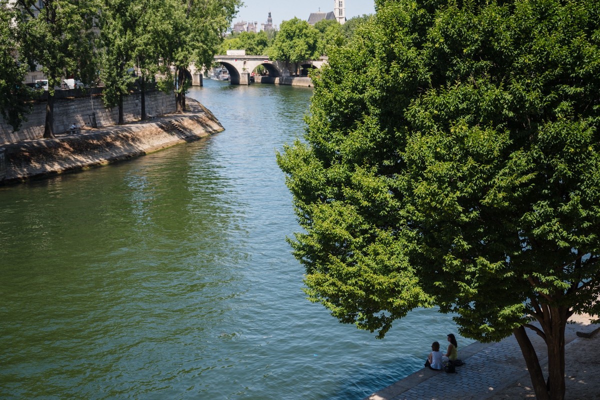 Mulheres conversam sob a sombra de uma árvore em braço do rio Sena — Foto: Dimitar Dilkoff/AFP