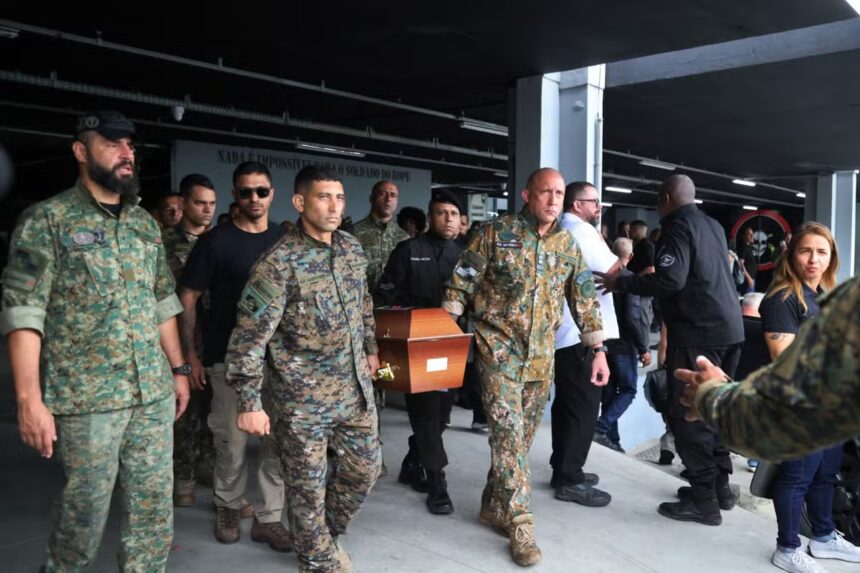 Um longo cortejo, saído da sede do Batalhão de Operações Especiais (Bope), em Laranjeiras, na Zona Sul do Rio, conduziu o corpo do terceiro-sargento Heber Carvalho da Fonseca, de 39 anos, até o Cemitério Jardim da Saudade, em Sulacap, na Zona Oeste da capital. Ele morreu na megaoperação policial da última terça-feira nos complexos da Penha e do Alemão. O trajeto de cerca de 40 quilômetros foi acompanhado por dezenas de veículos e um helicóptero da polícia. Batedores em motocicletas abriam caminho para o carro do Corpo de Bombeiros transportando o caixão, que desceu à sepultura no começo da tarde, sob uma fina chuva e com honras militares.