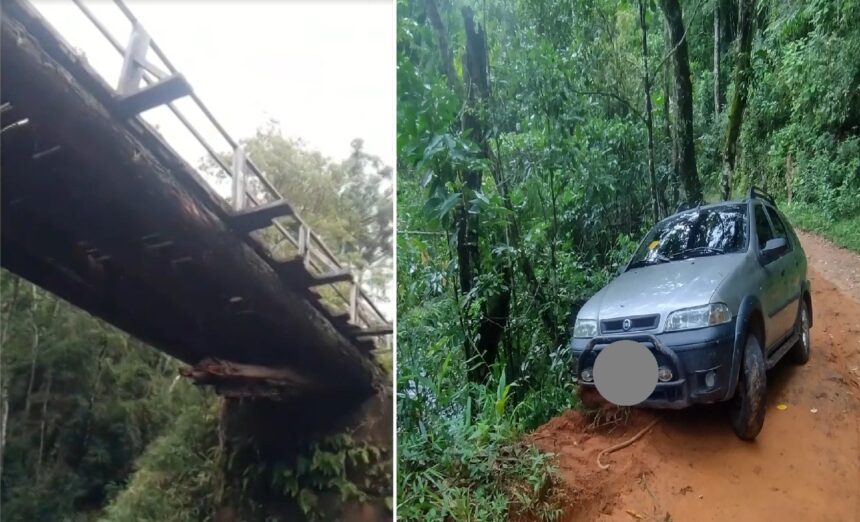 Ponte que cedou no Rio Macaé; carro impedido de passar pelas estradas.