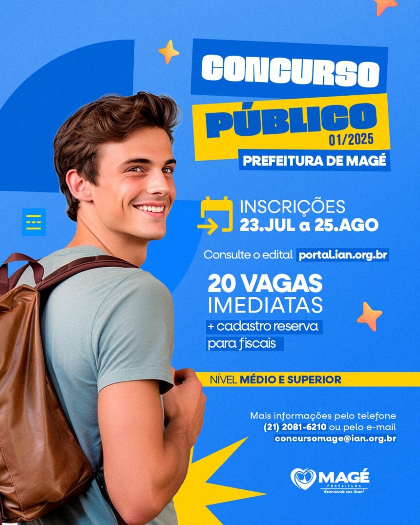 A Prefeitura de Magé informa que estão oficialmente abertas as inscrições para o Concurso Público nº 01/2025, conforme o Edital de Abertura publicado em 22 de julho de 2025. O certame tem como objetivo o provimento de 20 (vinte) vagas imediatas, além da formação de cadastro de reserva, para diversos cargos efetivos nas áreas de fiscalização.