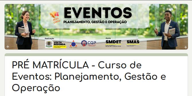 A Prefeitura de Volta Redonda, por meio de uma parceria entre a Secretaria Municipal de Desenvolvimento Econômico e Turismo (SMDET) e a Fundação Educacional de Volta Redonda (Fevre), está com inscrições abertas para o curso “Eventos: planejamento, gestão e operação”. Os interessados podem se inscrever até o dia 30 de abril (quinta-feira), de forma on-line pelo link https://forms.gle/gJQjuS7ybX9QVhNj6, ou presencialmente no Centro de Referência de Assistência Social (Cras) mais próximo de sua residência. Podem participar pessoas a partir de 18 anos. As vagas são limitadas.