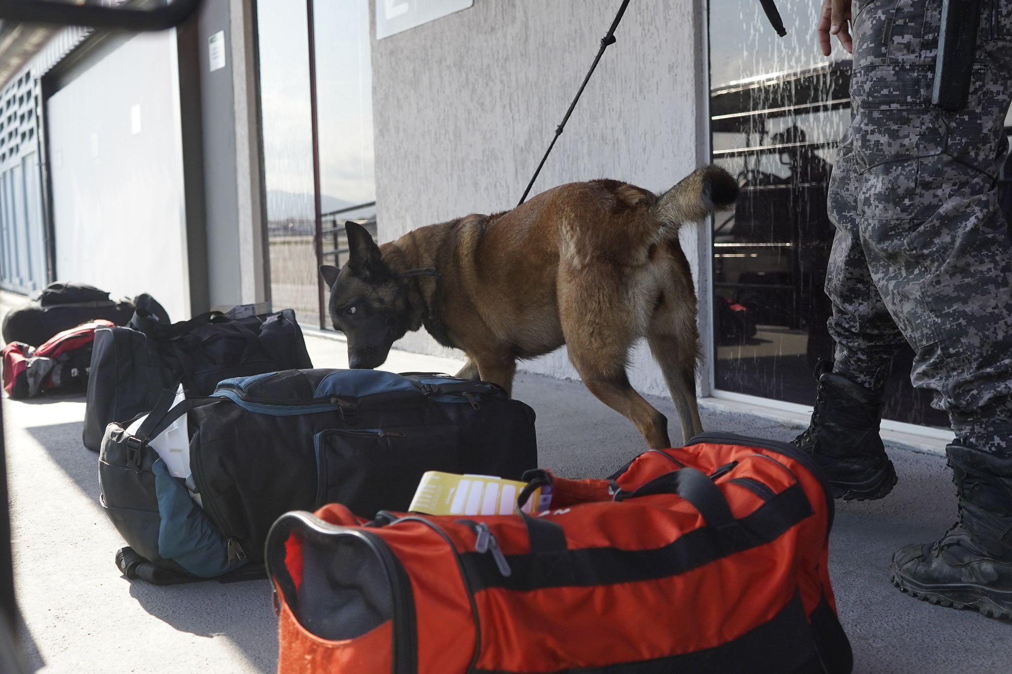 As cadelas Kitana e Tati, da espécie pastor belga malinois, farejaram as bagagens de passageiros e também foram levadas para transitar entre pessoas no saguão do aeroporto.