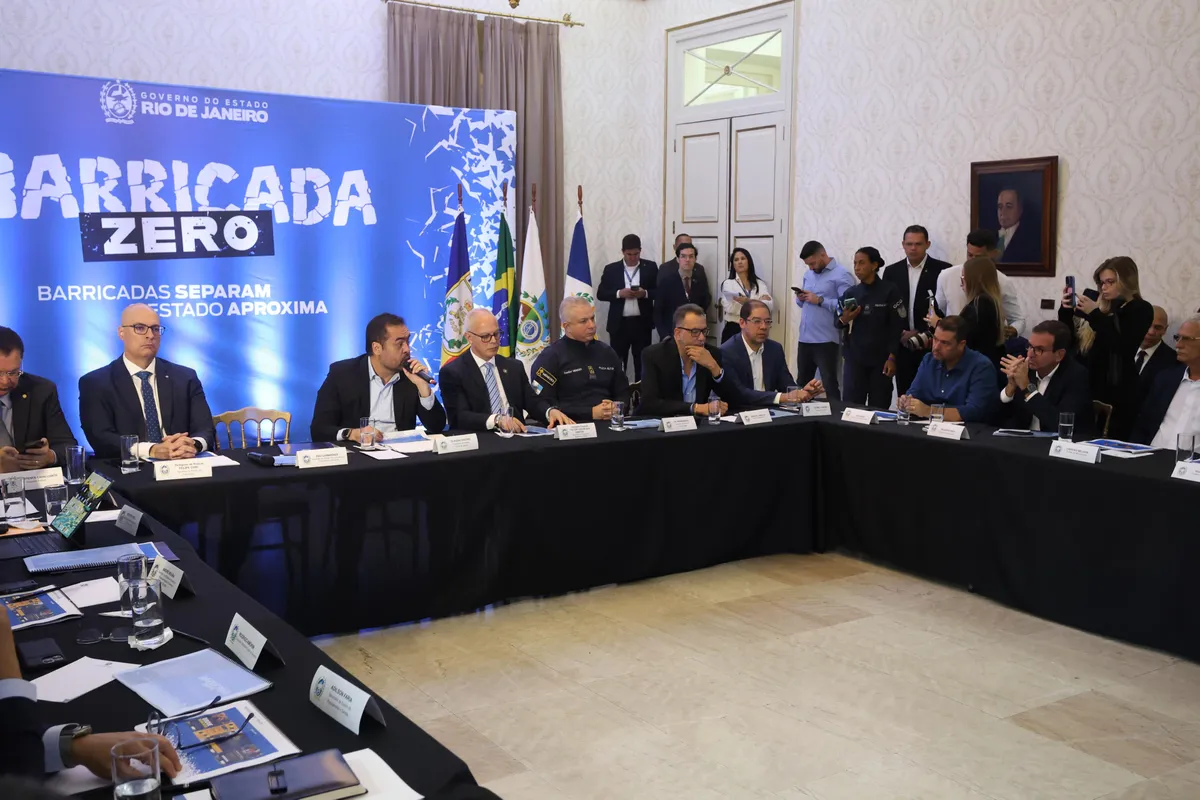 O governador Cláudio Castro reuniu na manhã desta segunda-feira, no Palácio Guanabara, prefeitos e representantes de 12 municípios da Região Metropolitana para apresentar o plano Barricada Zero, uma força-tarefa que pretende remover as 13.604 barreiras mapeadas pelo estado em áreas dominadas pelo crime organizado. O programa, inspirado no modelo iniciado em Belford Roxo, marca uma nova fase da política de segurança após a megaoperação que deixou 121 mortos nos complexos do Alemão e da Penha, há três semanas — a mais letal da história do Rio.