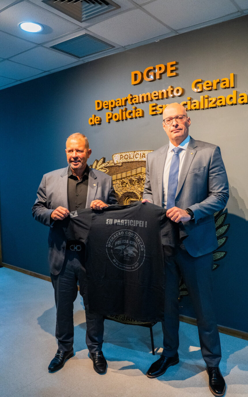 Deputado Guilherme Delaroli (E) esteve com o secretário de Polícia Civil, Felipe Curi, na manhã desta terça-feira (3), na Cidade da PolíciaCristiano Masruha/Divulgação