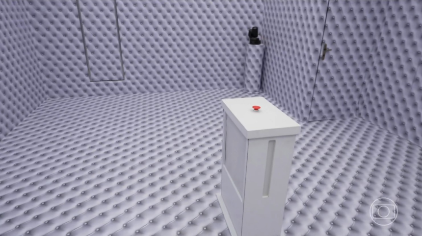Os participantes que desejarem sair do quarto devem apertar o botão vermelho. “Os dois últimos que desistirem conquistam sua vaga na casa do BBB”, instruiu a voz aos candidatos.