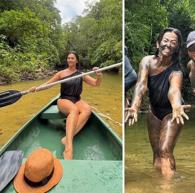 Aos 47 anos, a intérprete da eterna Tiazinha postou registros da viagem, onde aparece de maiô praticando remo e também tomando banho de lama.