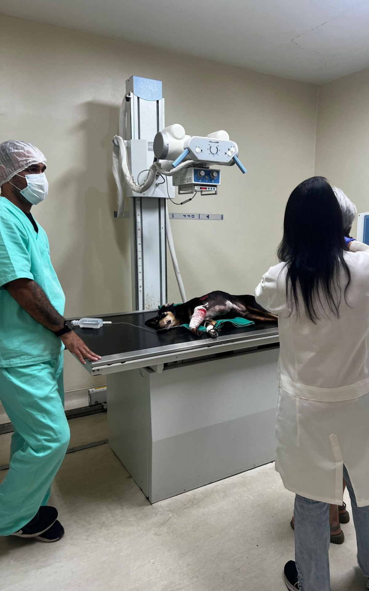 A cachorrinha passou por cirurgia no Instituto Municipal de Medicina Veterinária Jorge Vaitsman, na Mangueira, para colocação de um fixador externo, e deve fazer novos procedimentos para evitar amputação, mas passa bem.