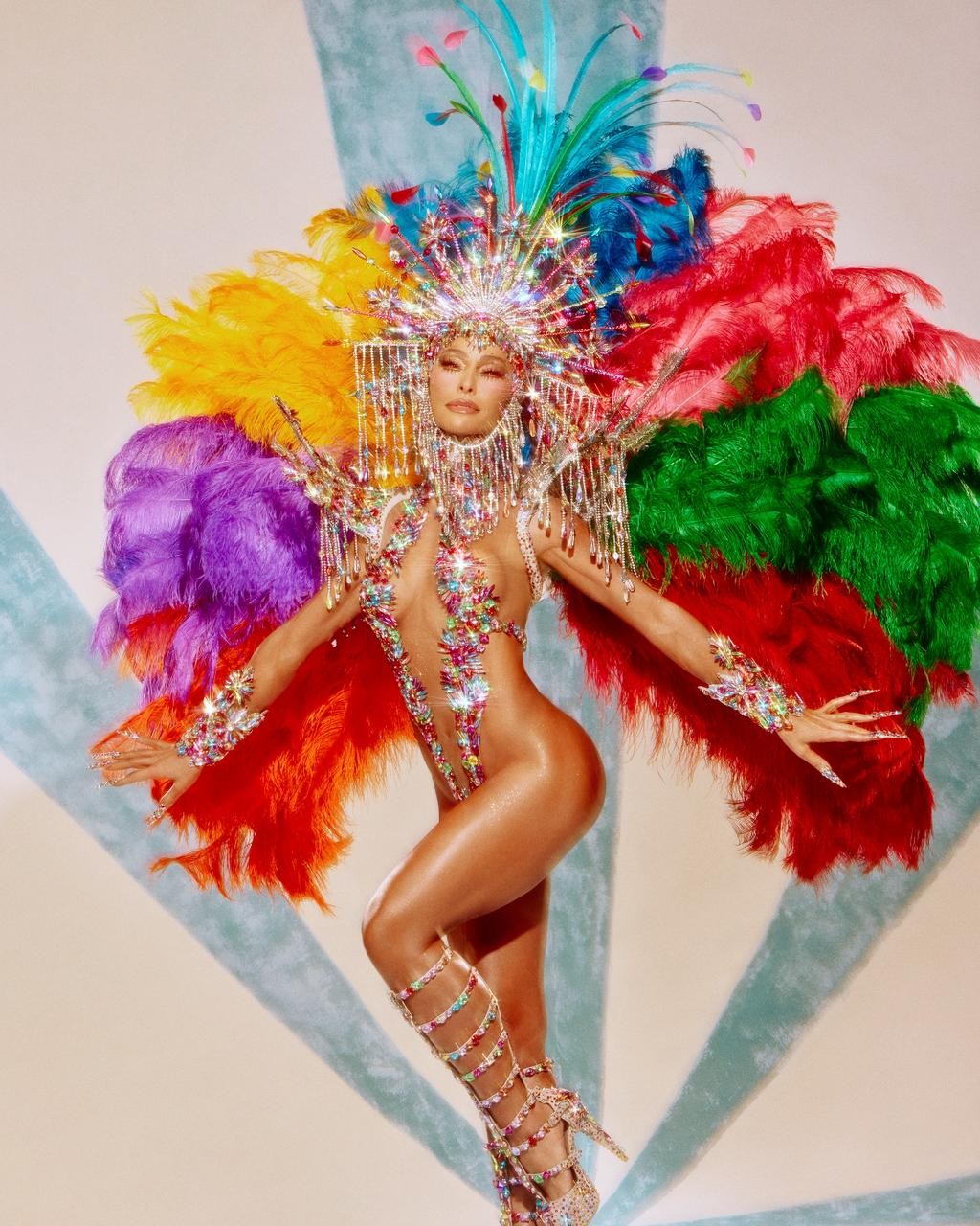 O figurino aposta em um body inteiramente cravejado de pedrarias coloridas, aplicadas como respingos de tinta sobre o corpo. Vermelho, azul, amarelo, verde e roxo se misturam numa composição vibrante que remete às pinceladas intensas de Heitor dos Prazeres, que eternizou o cotidiano brasileiro com ritmo e poesia.