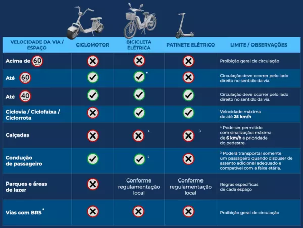 O uso de capacete tornou-se obrigatório para todos os modais. Para os ciclomotores — que são os veículos motorizados sem pedais — a regulamentação é ainda mais severa: eles estão banidos de ciclovias, ciclofaixas e calçadas. Os condutores desses veículos precisam de carteira de habilitação e o veículo deve ser devidamente emplacado e licenciado, com prazo de regularização até o fim de 2026.