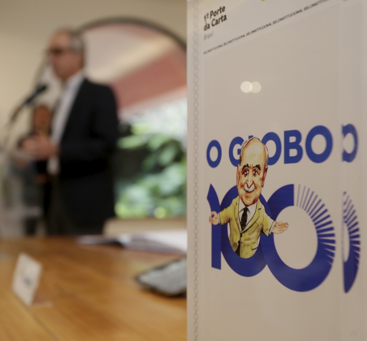 Um selo postal em comemoração ao centenário do GLOBO foi lançado nesta terça-feira. A peça gráfica, que traz uma caricatura de Roberto Marinho criada por Chico Caruso sobre a logo especial dos 100 anos do jornal, foi feita pelos Correios e apresentada pelo presidente da empresa, Fabiano Silva dos Santos. A cerimônia na Casa Roberto Marinho contou com a presença de Sônia Faustino, secretária executiva do Ministério das Comunicações, e de João Roberto Marinho, presidente do Conselho de Administração e presidente do Grupo Globo.