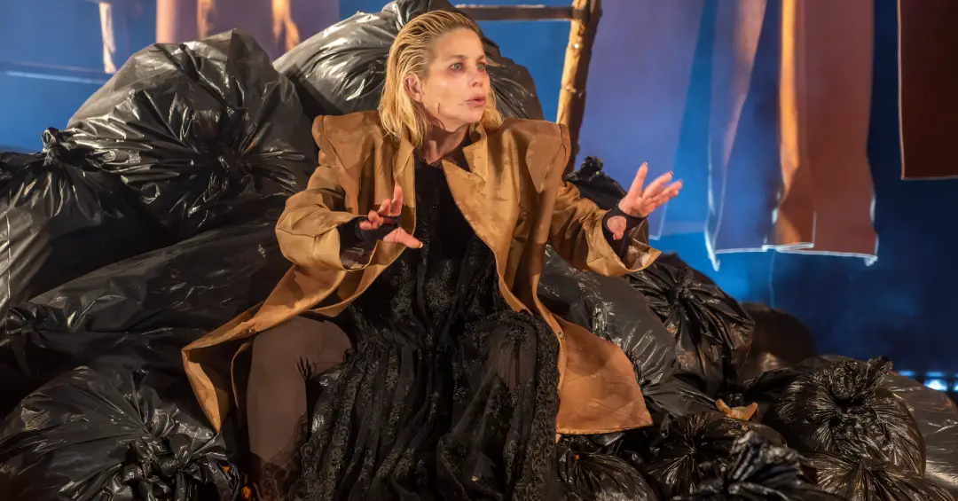 O cenário, feito de sacos pretos de lixo, evoca tanto o descarte urbano quanto o da própria humanidade, num gesto plástico poderoso. A iluminação, por sua vez, cria uma atmosfera de devastação e estranhamento, como se víssemos os resquícios da Terra após o colapso civilizacional.