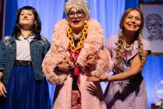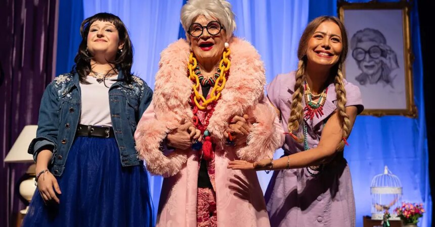 A encenação ganha força ao colocar frente a frente duas gerações. De um lado, experiência, memória e liberdade conquistada; do outro, desejo, urgência e construção de futuro. Sofia vive uma jovem repórter que entrevista uma personagem inspirada na icônica Iris Apfel — figura que, aliás, nunca pediu licença para ser quem era. O que começa como entrevista vira um jogo gostoso de escuta, provocações e cumplicidade.