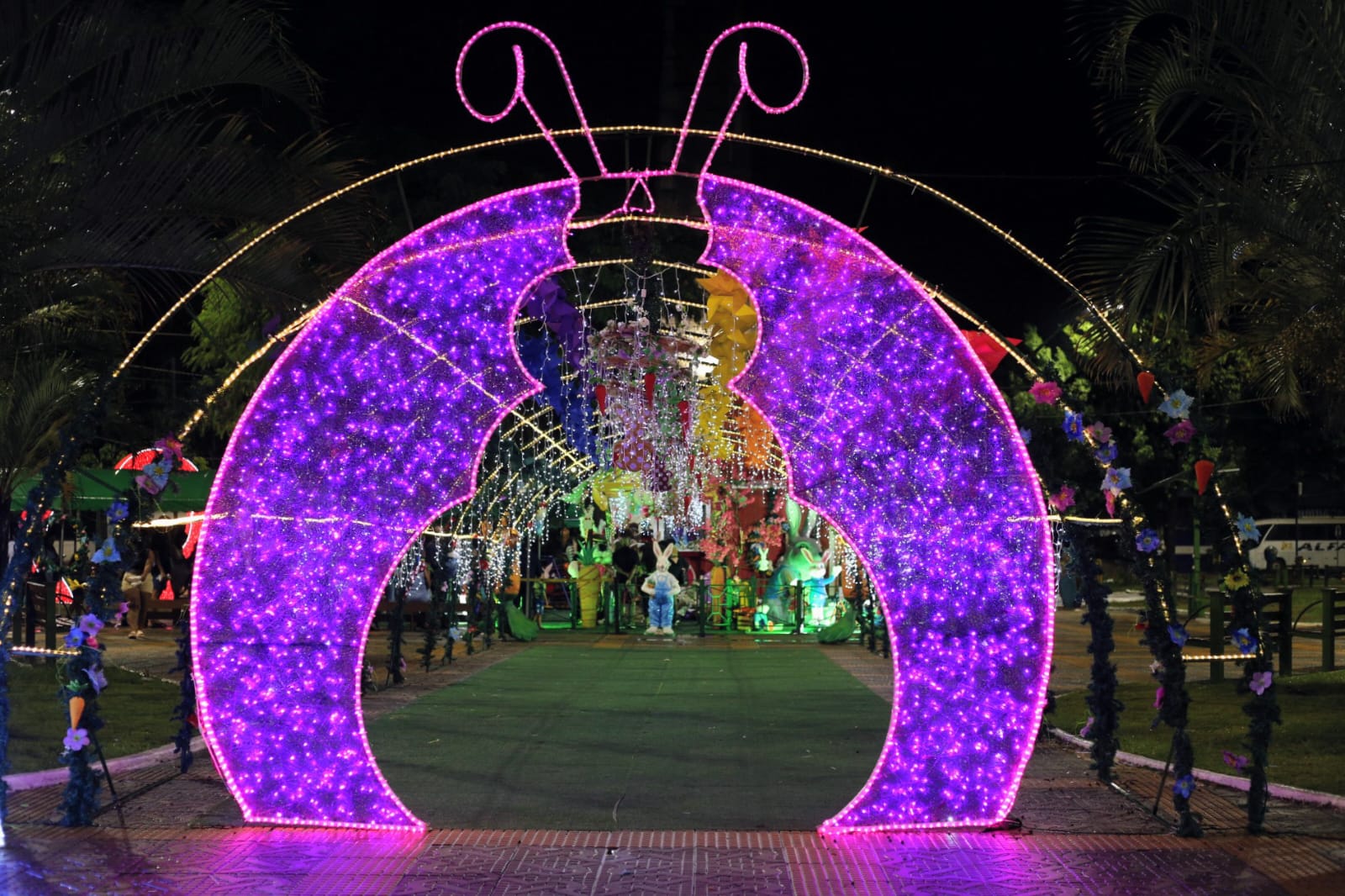 Outro grande destaque desta edição foi a decoração temática, que transformou a Praça Brasil em um verdadeiro cenário de Páscoa. Logo na entrada, o público foi recebido por um portal em formato de coelho, seguido por um túnel iluminado e decorado com cataventos coloridos, criando uma experiência imersiva.