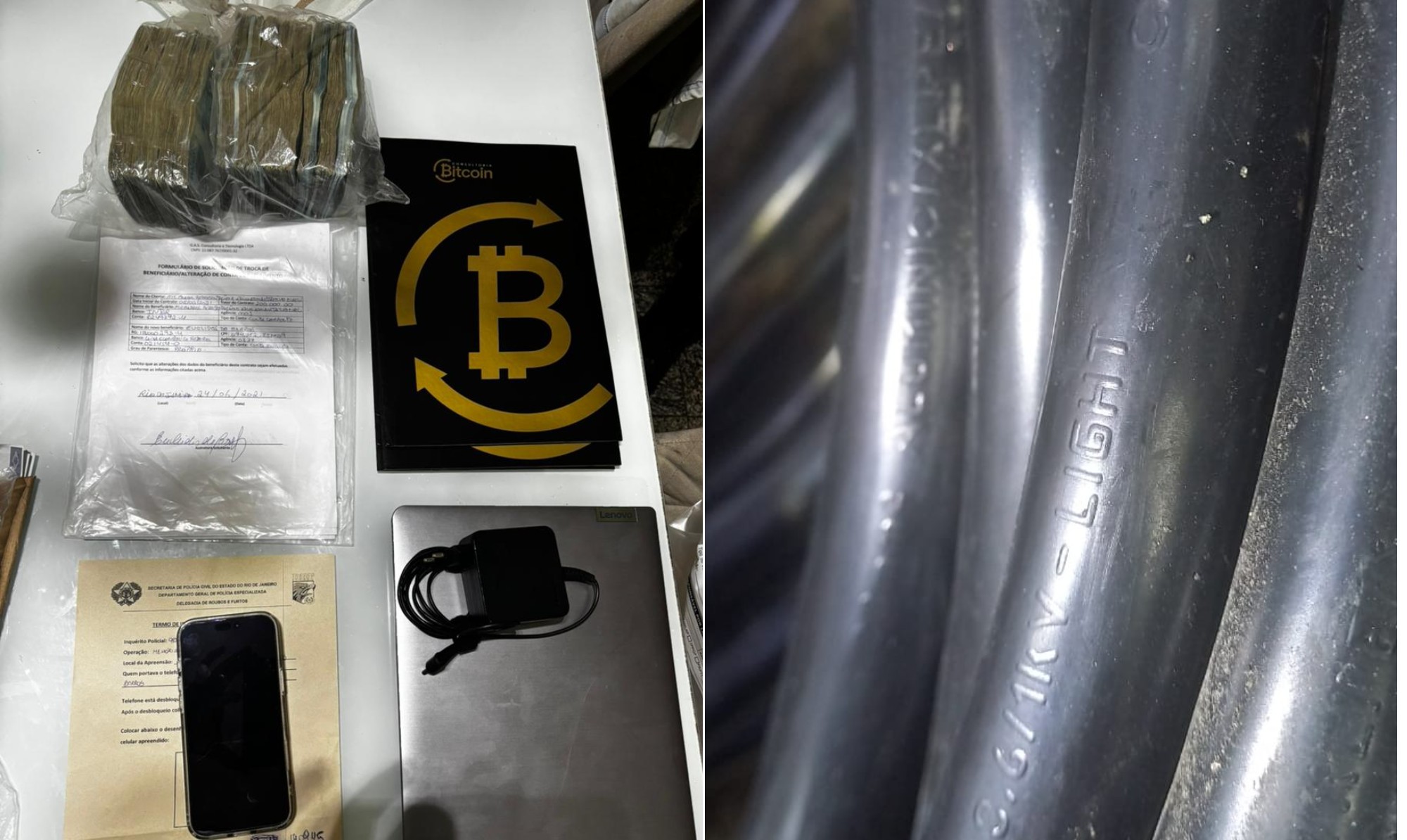 Lista de apreensões da Polícia Civil inclui aparelho, celular, computador, malote de dinheiro e cabos da Light — Foto: Reprodução