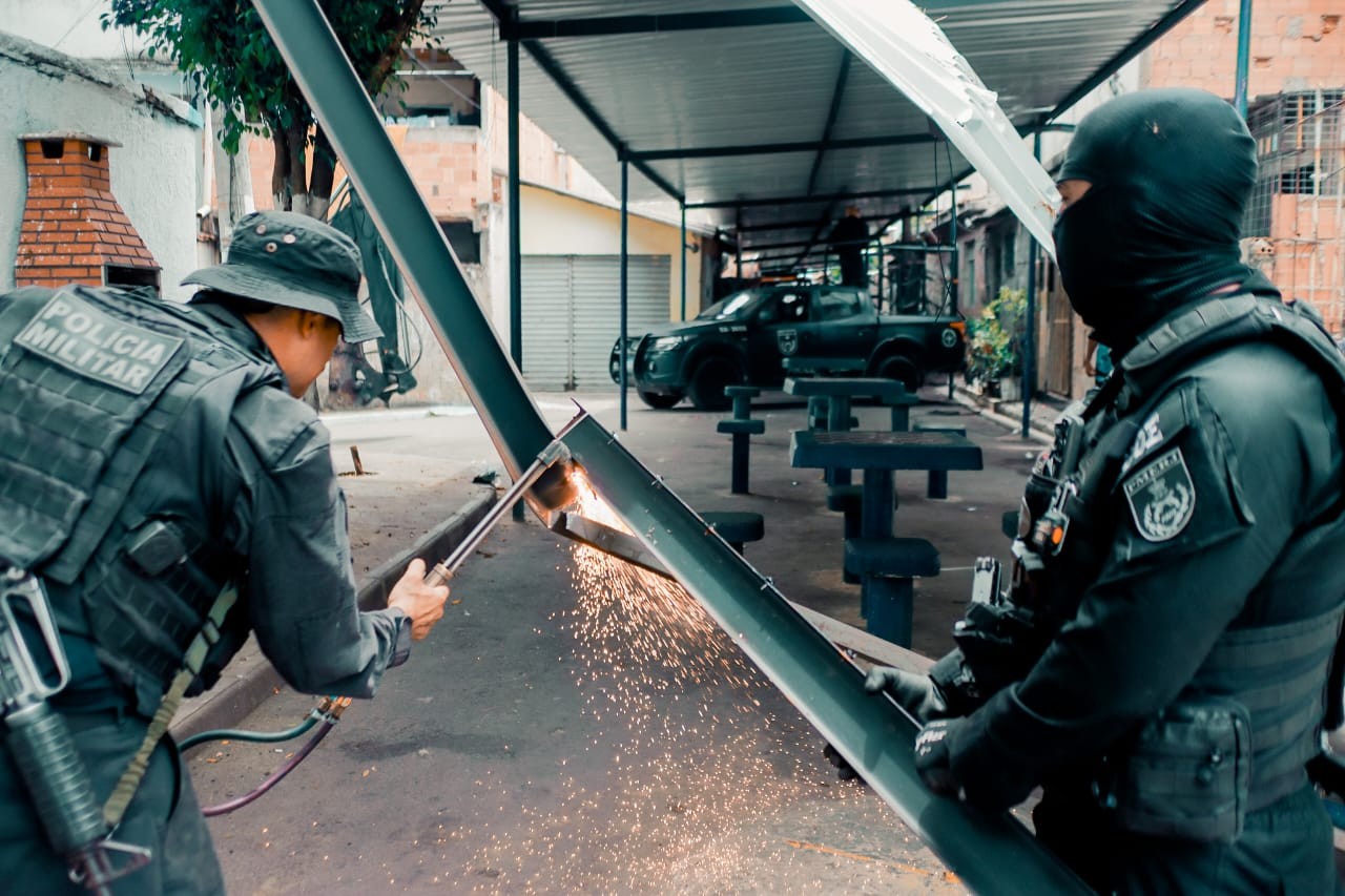 A ação de ontem, que mobilizou 520 agentes, mirou grupos que roubam cargas e veículos de luxo. Cinco pessoas foram presas. Houve a apreensão ainda de três fuzis e duas pistolas. Sete carros roubados, alguns deles elétricos, foram recuperados. No fim da ação, o telhado foi derrubado pelos policiais.